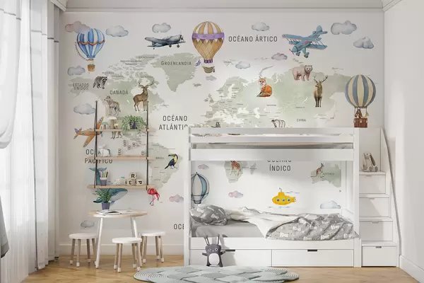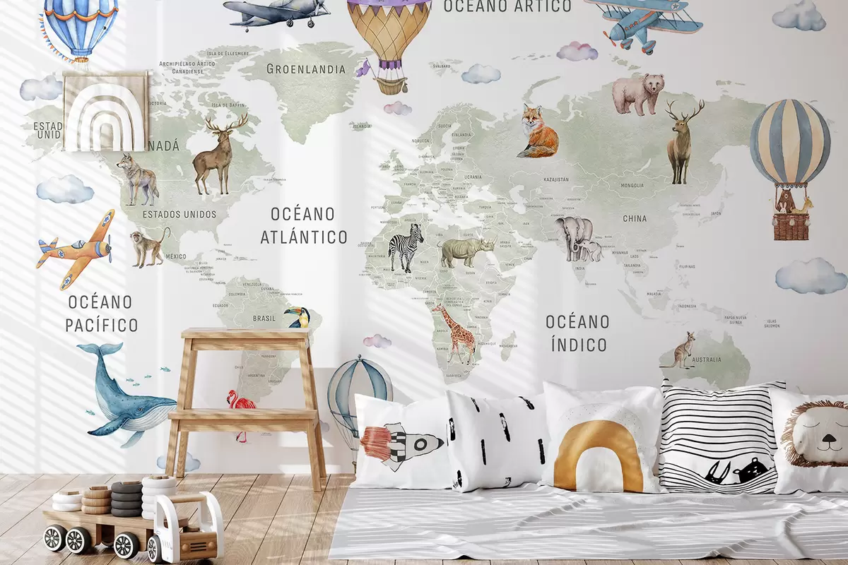 Fototapet Harta pentru copii în stil acuarelă, cu animale și baloane cu aer cald. Limba spaniolă. Culoare verde. Nr. c00001es