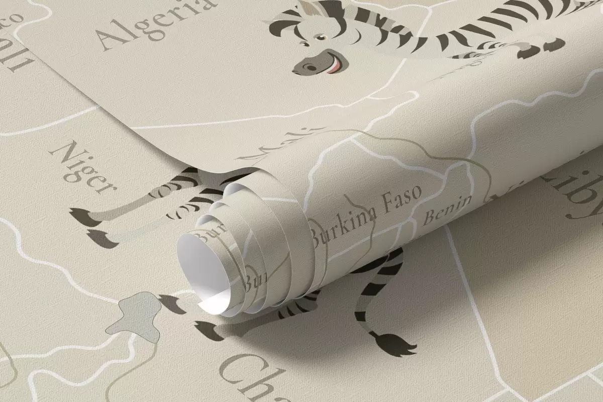 Fototapet Harta lumii pentru copii cu animale, avioane și baloane cu aer cald. Limba engleză. Culoare bej. Nr. c00003en
