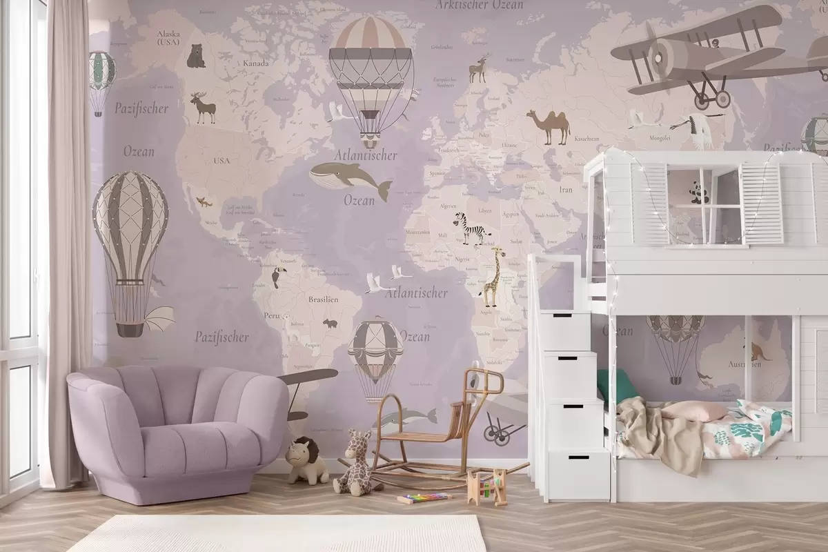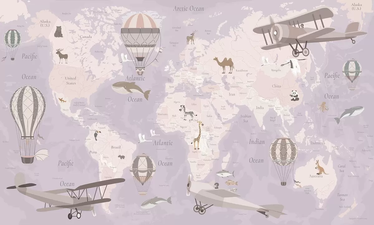Fototapet Harta lumii pentru copii cu animale, avioane și baloane cu aer cald. Limba engleză. Culoare violet. Nr. c00003env4