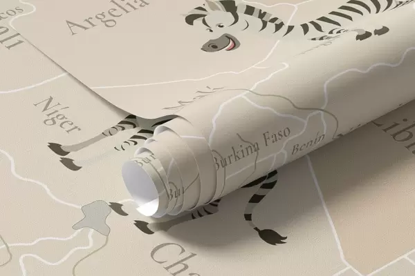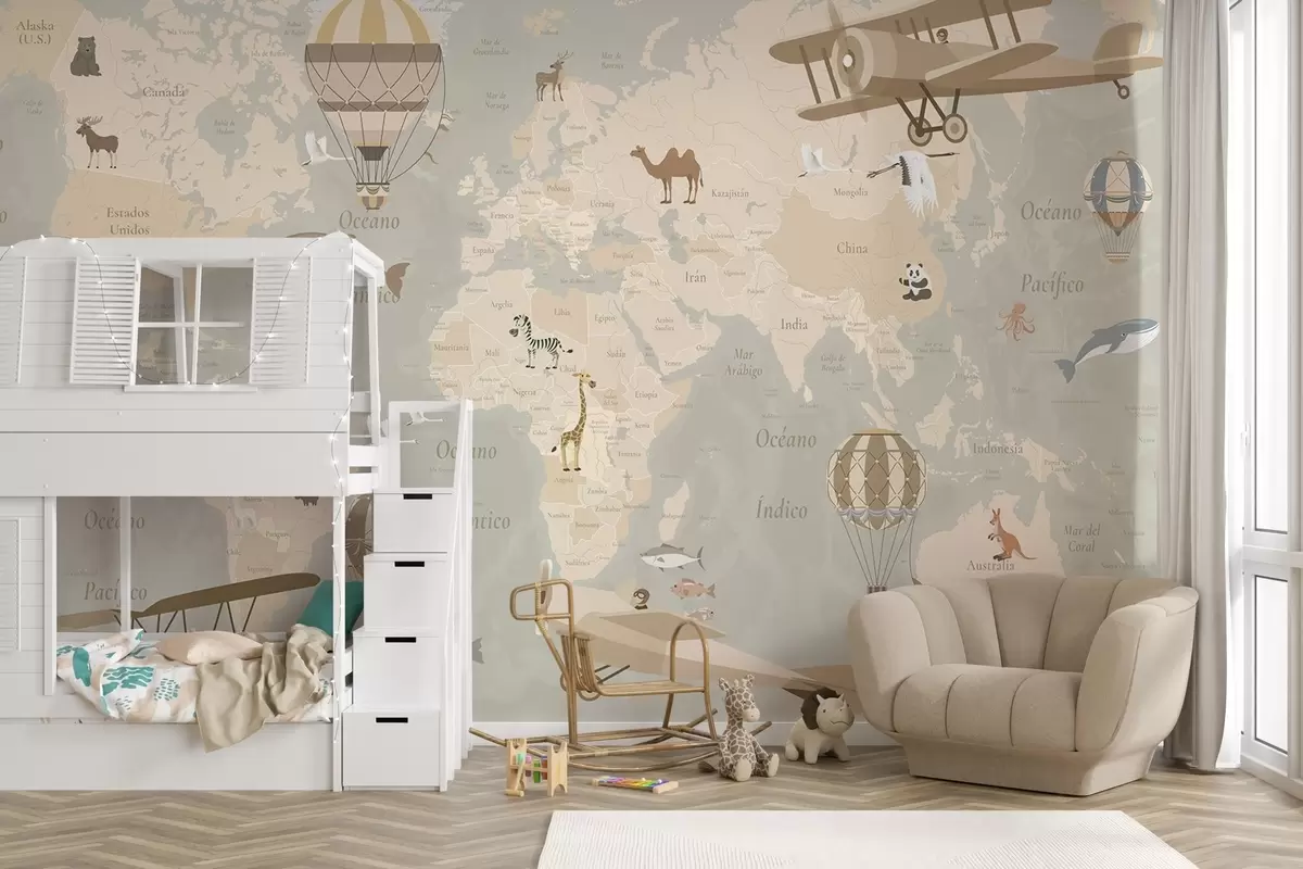 Fototapet Harta lumii pentru copii cu animale, avioane și baloane cu aer cald. Limba spaniolă. Culoare bej. Nr. c00003es