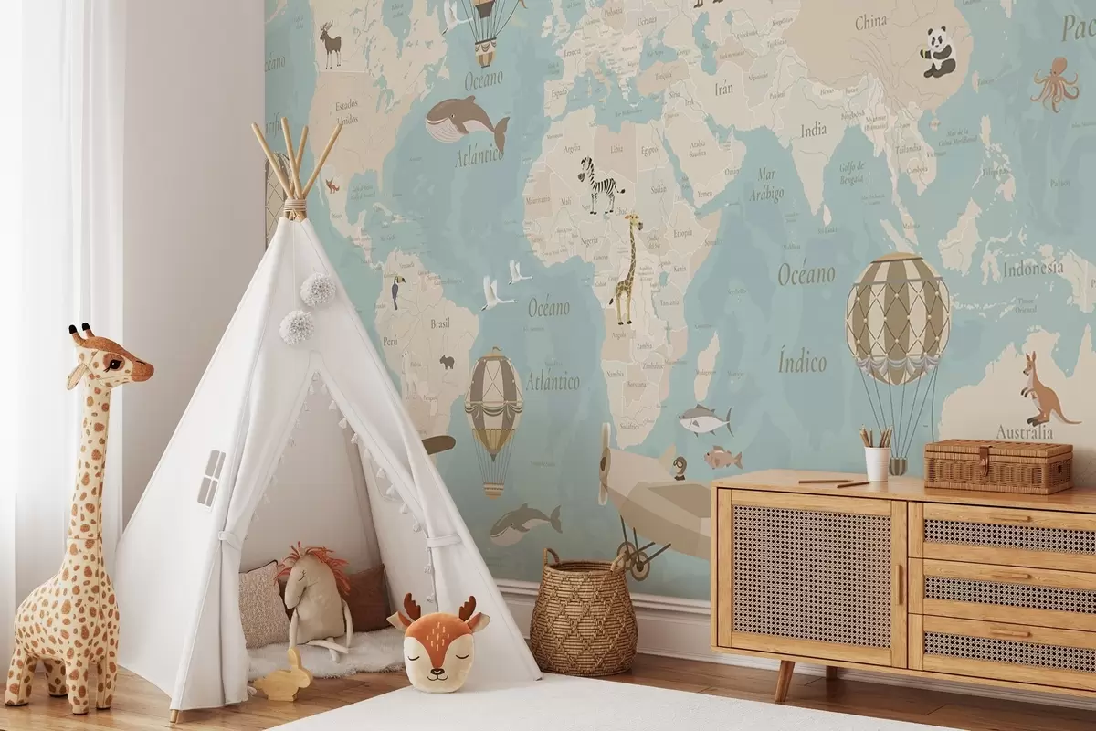 Fototapet Harta lumii pentru copii cu animale, avioane și baloane cu aer cald. Limba spaniolă. Culoare albastră. Nr. c00003esv1