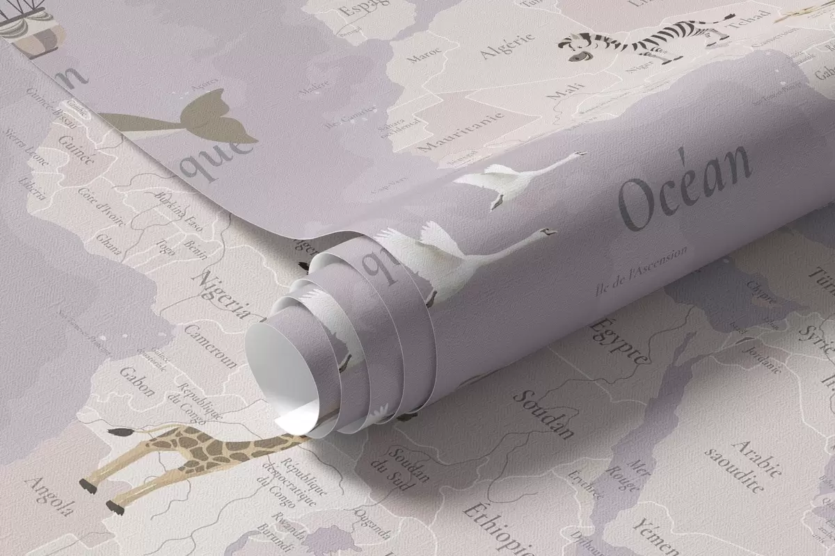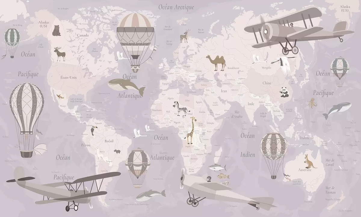 Fototapet Harta lumii pentru copii cu animale, avioane și baloane cu aer cald. Limba franceză. Culoare violet. Nr. c00003frv4