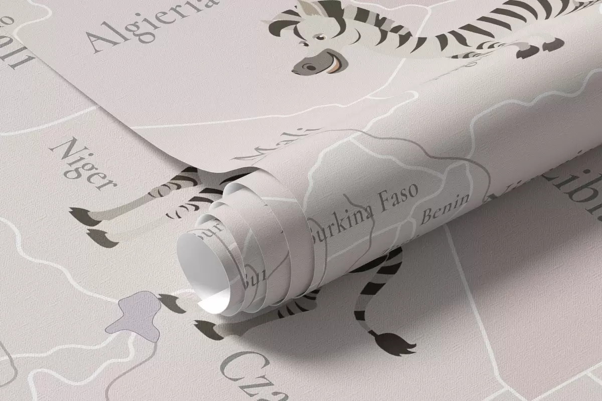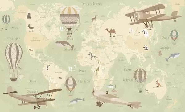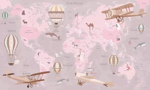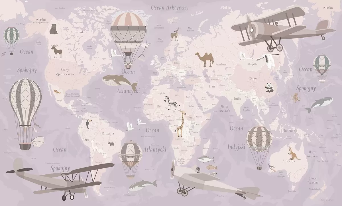 Fototapet Harta lumii pentru copii cu animale, avioane și baloane cu aer cald. Limba poloneză. Culoare violet. Nr. c00003plv4