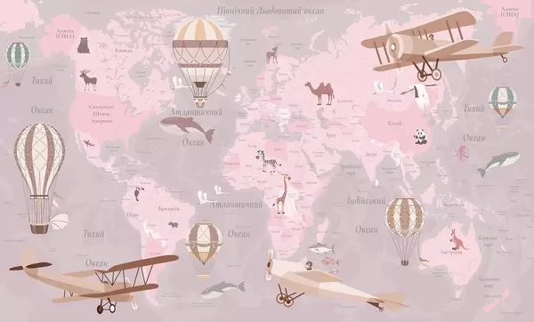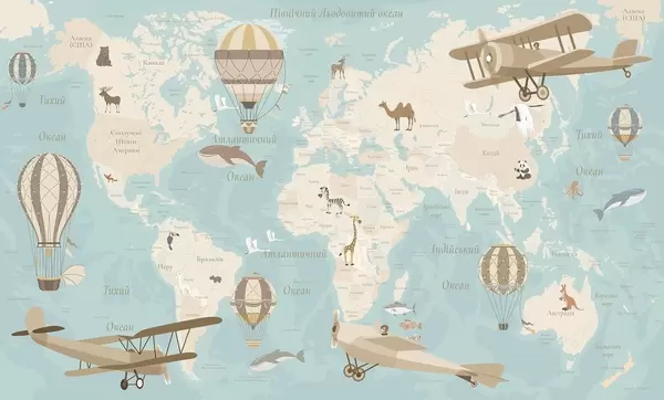 Fototapet Harta lumii pentru copii cu animale, avioane și baloane cu aer cald. Limba ucraineană. Culoare albastră. Nr. c00003ukv1