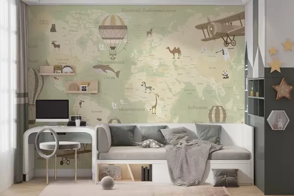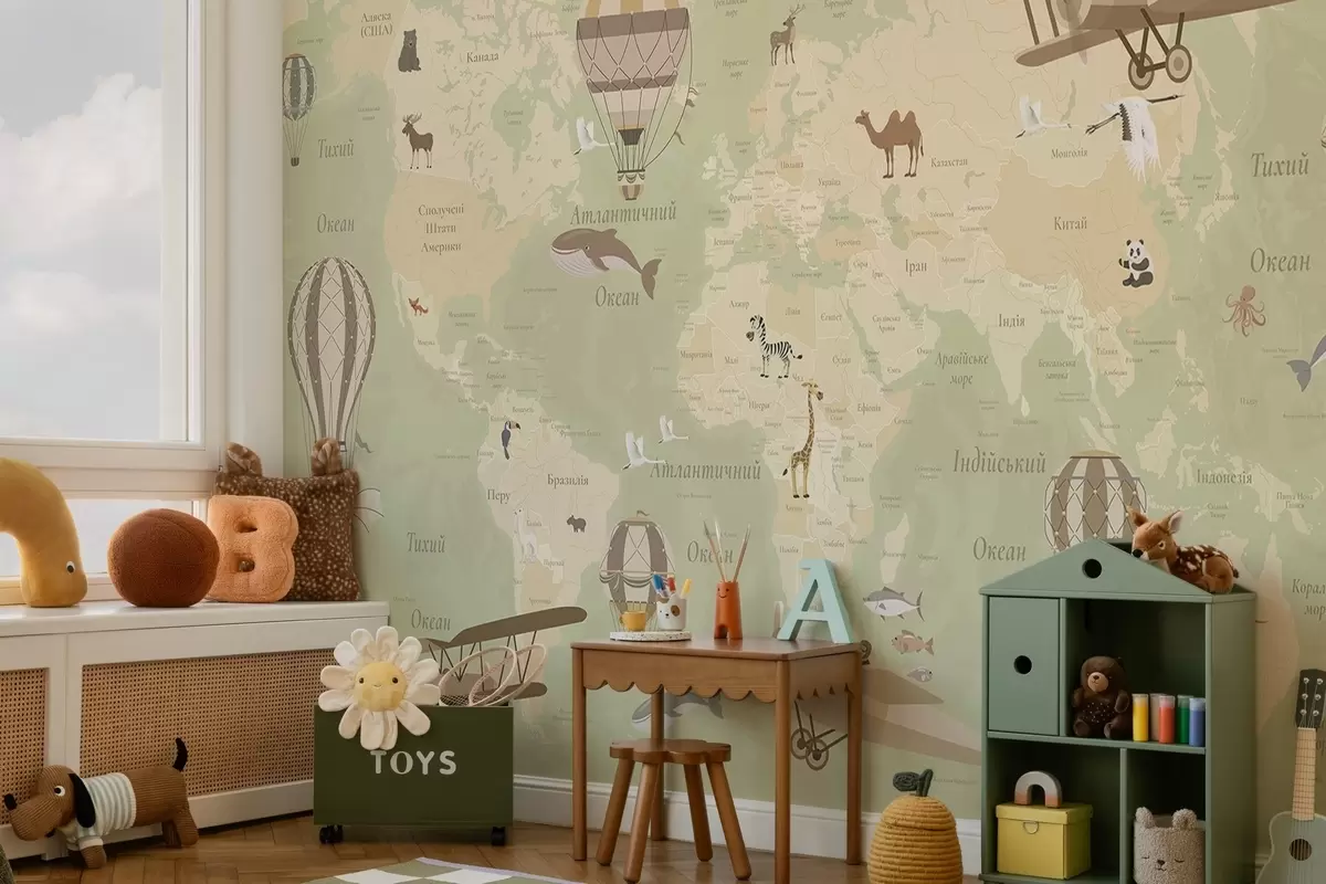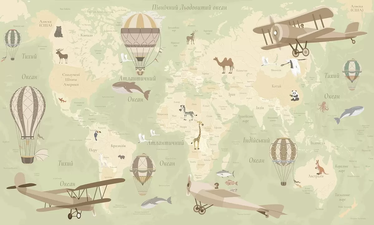 Fototapet Harta lumii pentru copii cu animale, avioane și baloane cu aer cald. Limba ucraineană. Culoare verde. Nr. c00003ukv2