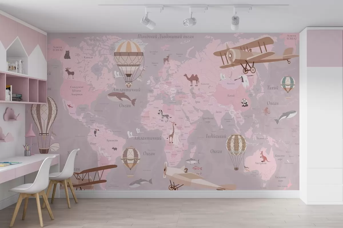 Fototapet Harta lumii pentru copii cu animale, avioane și baloane cu aer cald. Limba ucraineană. Culoare roz. Nr. c00003ukv3
