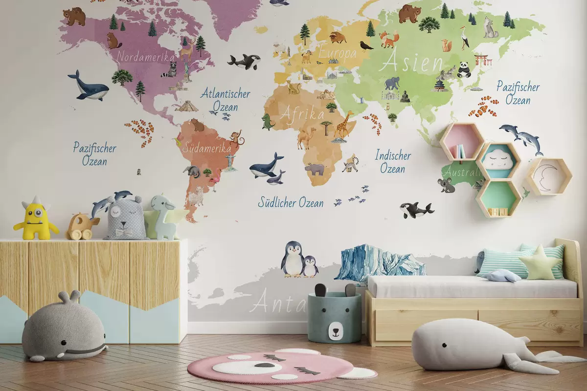 Fototapet O hartă colorată în stil acuarelă, care prezintă animale, plante și elemente arhitecturale. Legende în limba germană Nr. c00009de