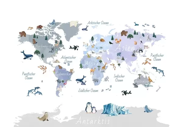 Fototapet O hartă albastră în stil acuarelă, cu animale, plante și elemente arhitecturale. Legende în limba germană Nr. c00009dev1