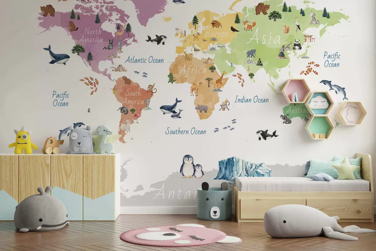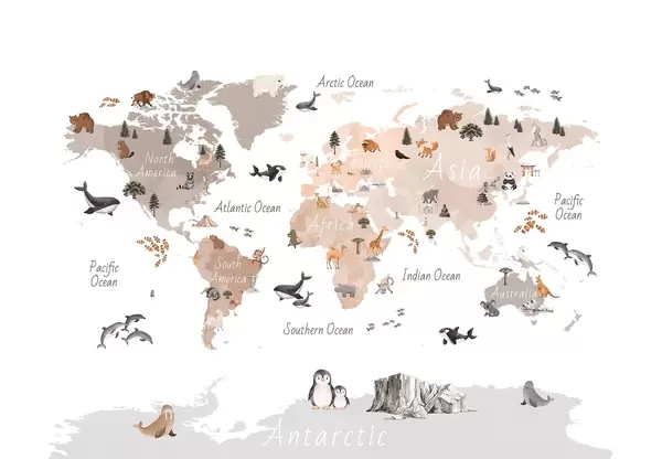 Fototapet O hartă colorată în stil acuarelă, care prezintă animale, plante și elemente arhitecturale. Etichete în limba engleză Nr. c00009en