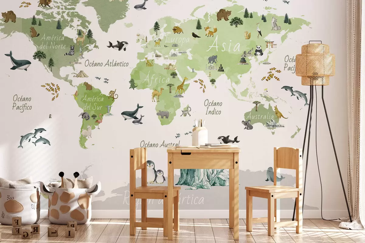 Fototapet O hartă verde în stil acuarelă, cu animale, plante și elemente arhitecturale. Inscripții în spaniolă Nr. c00009esv2