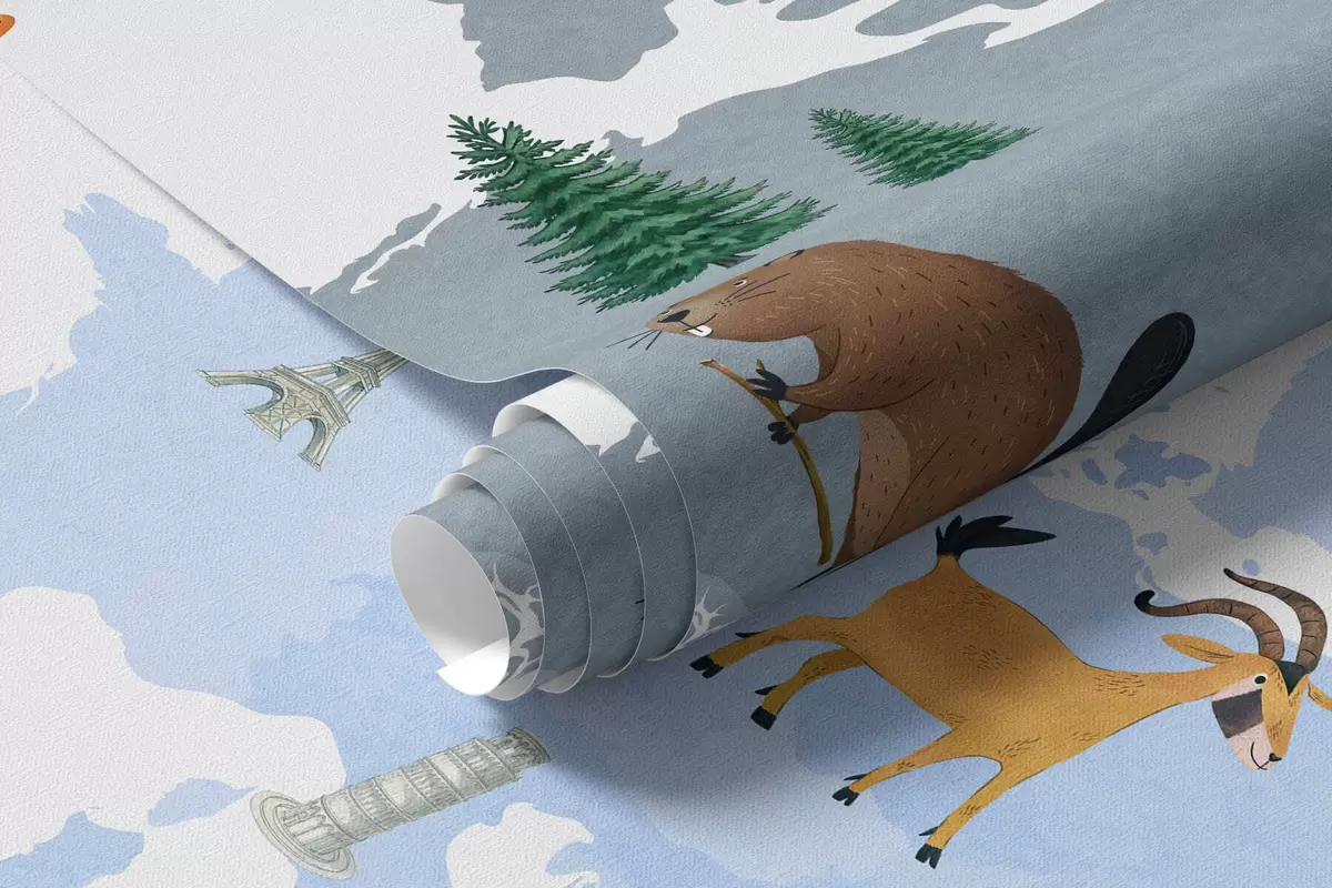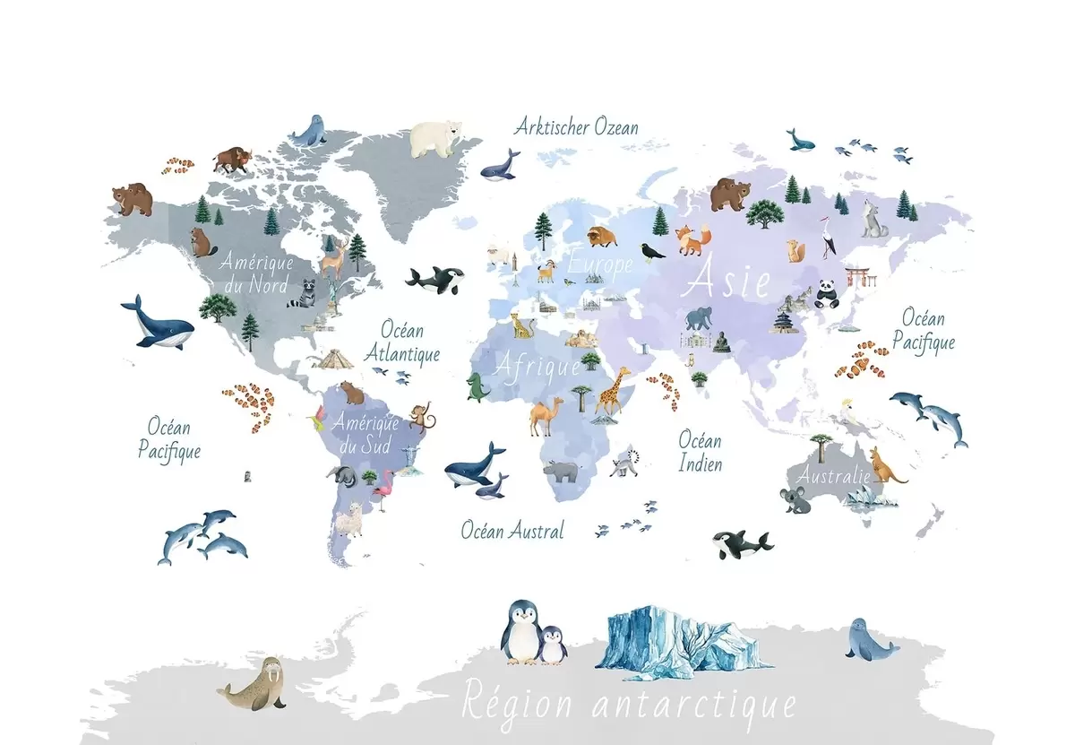 Fototapet O hartă albastră în stil acuarelă, cu animale, plante și elemente arhitecturale. Legende în limba franceză Nr. c00009frv1