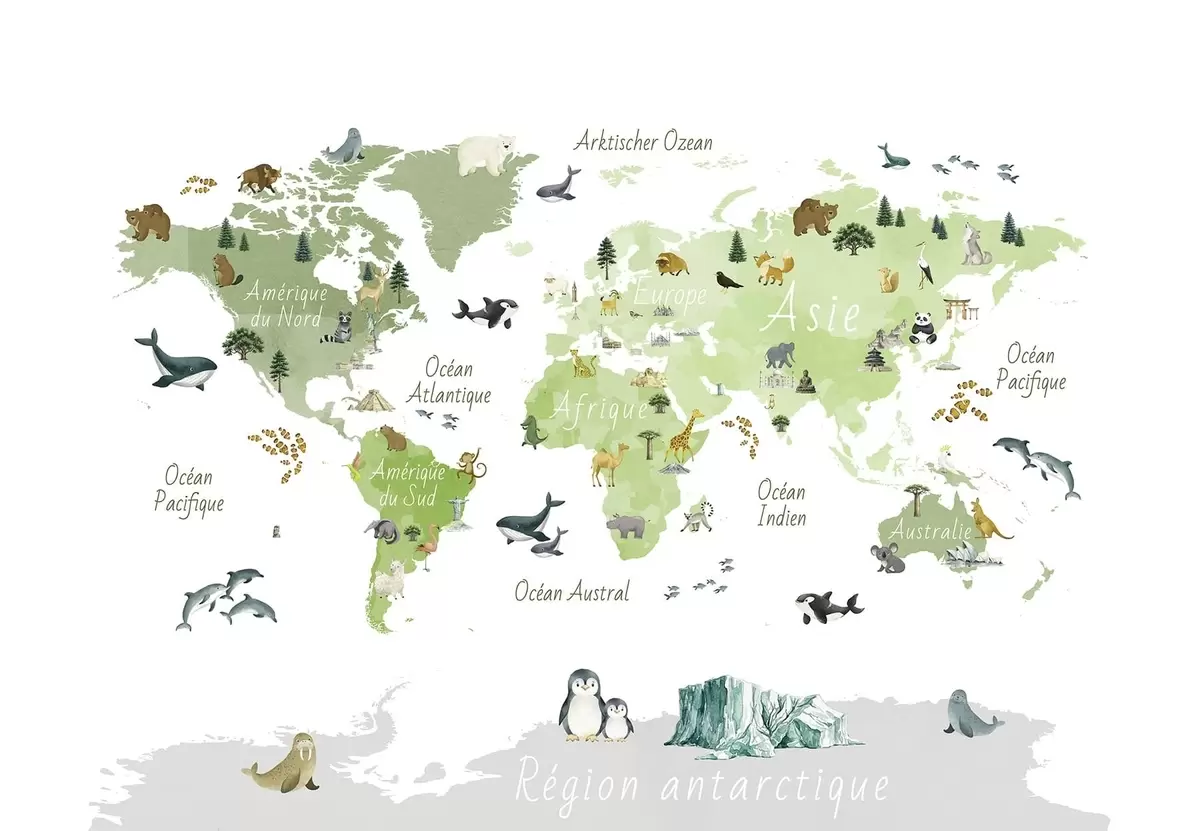 Fototapet O hartă verde în stil acuarelă, cu animale, plante și elemente arhitecturale. Inscripții în limba franceză Nr. c00009frv2