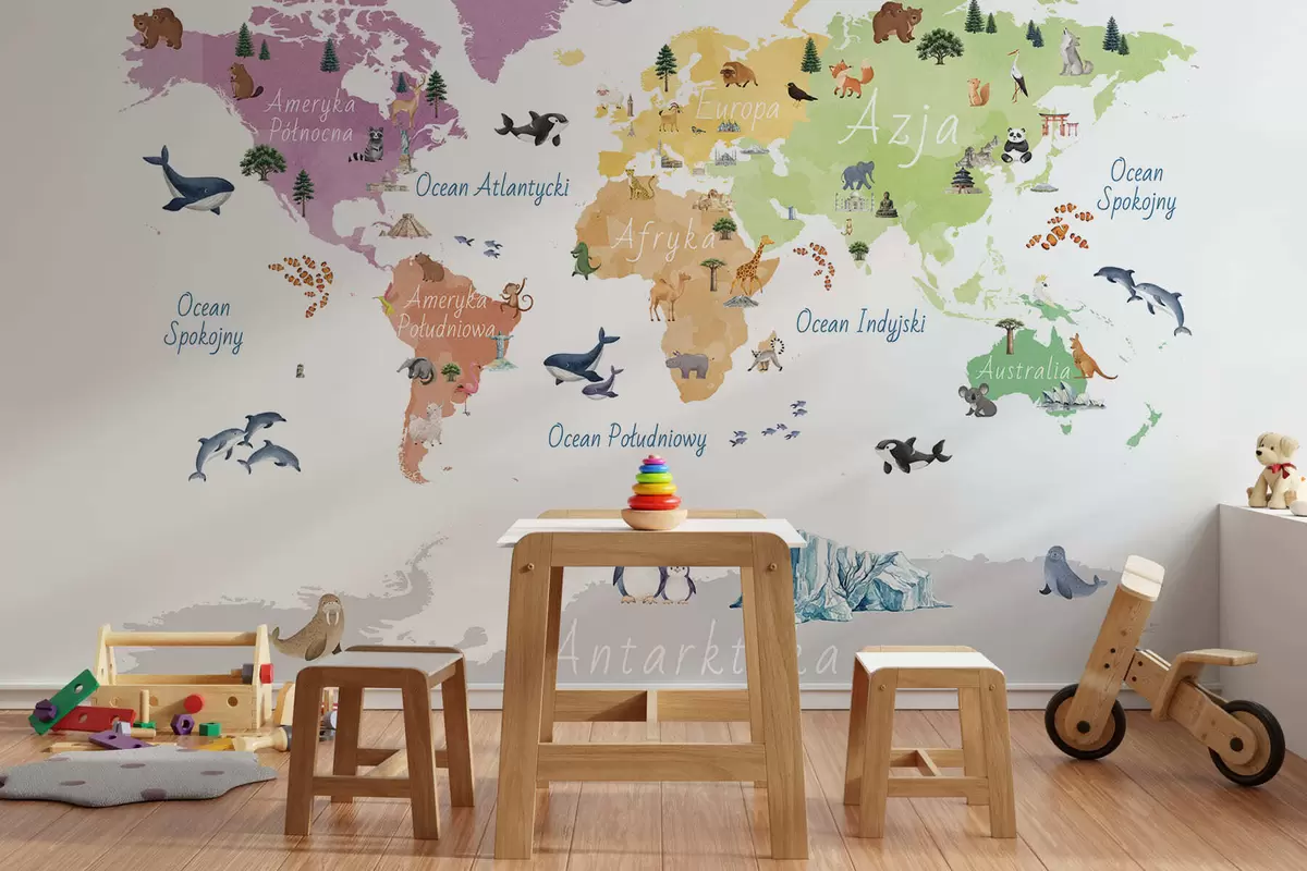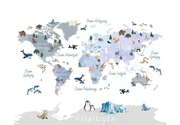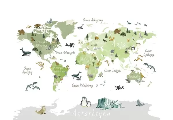 Fototapet O hartă colorată în stil acuarelă, care prezintă animale, plante și elemente arhitecturale. Legende în limba poloneză Nr. c00009pl