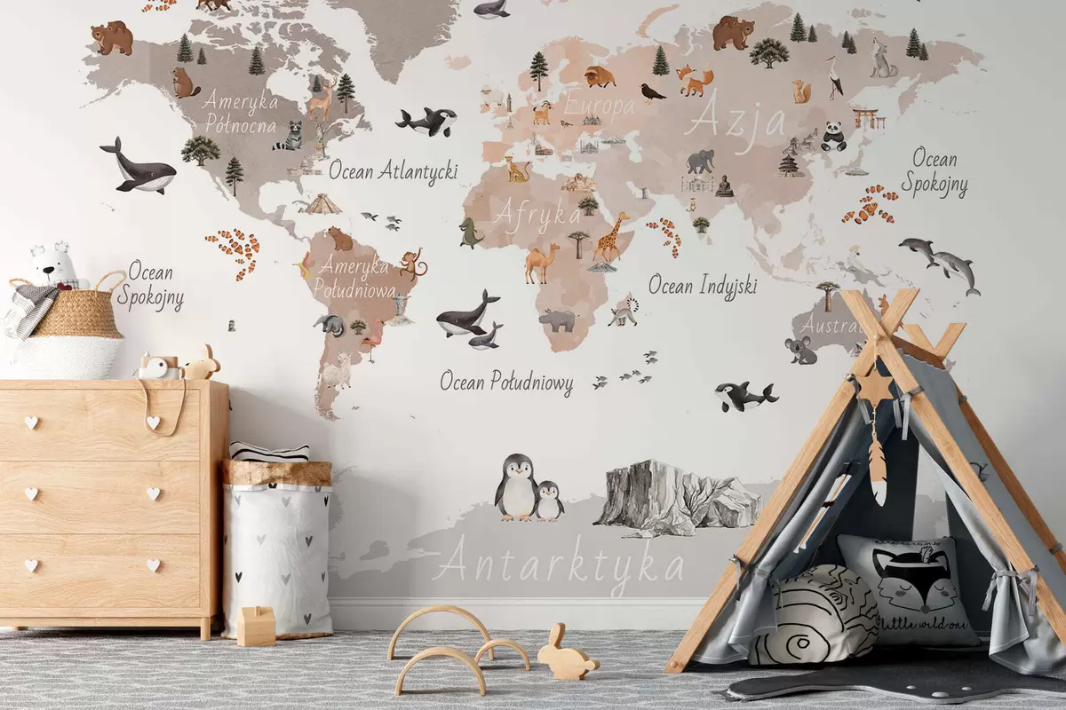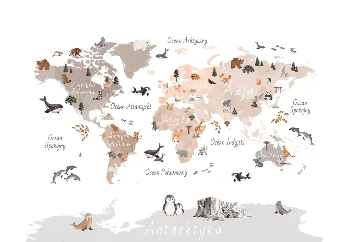 Fototapet O hartă în nuanțe de bej, realizată în stil acuarelă, care prezintă animale, plante și elemente arhitecturale. Etichete în limba poloneză Nr. c00009plv3