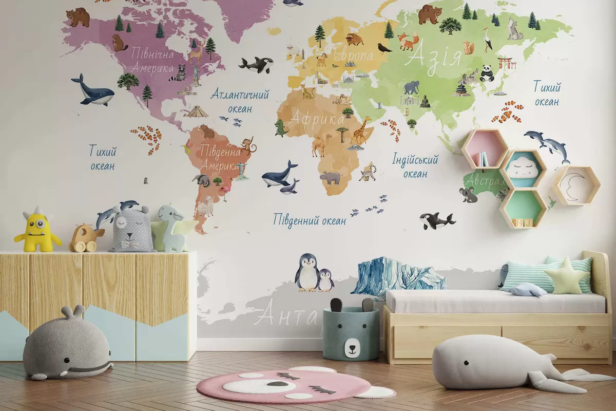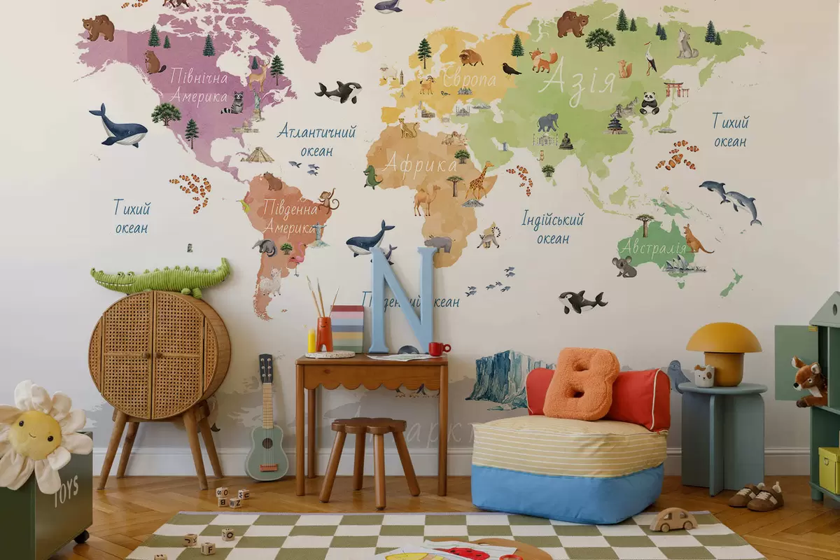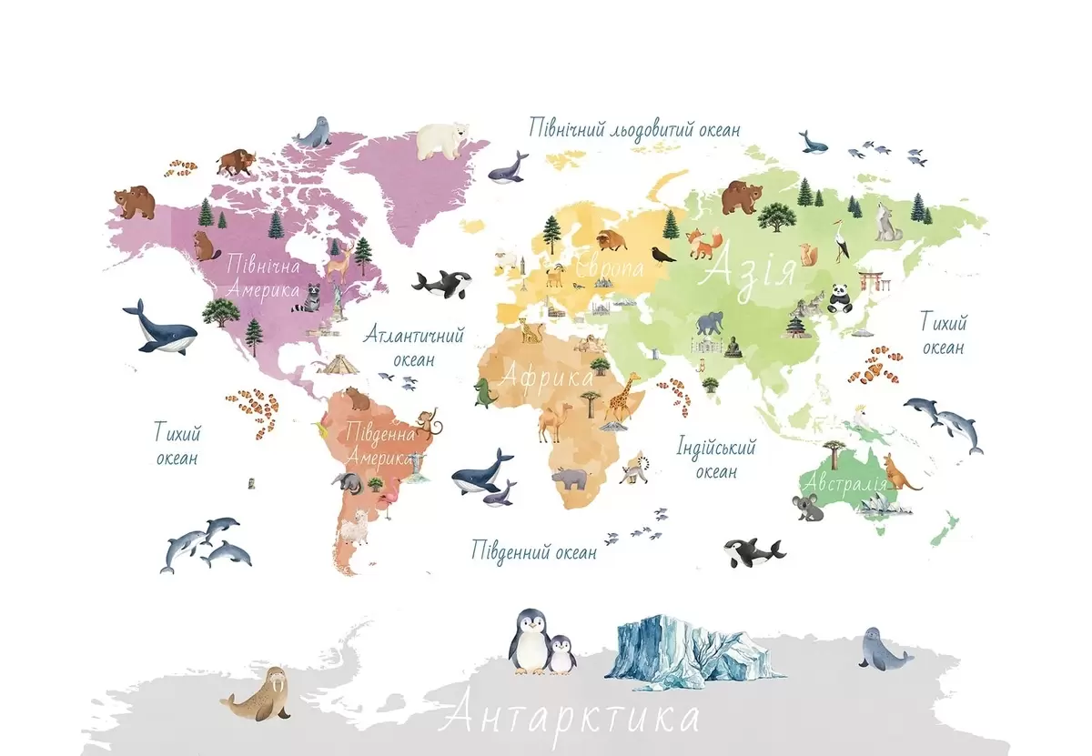 Fototapet O hartă colorată în stil acuarelă, care prezintă animale, plante și elemente arhitecturale. Legende în limba ucraineană Nr. c00009uk
