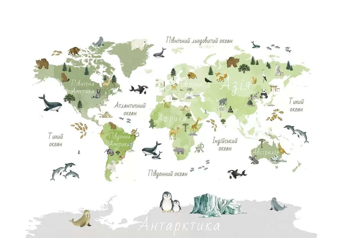 Fototapet O hartă verde în stil acuarelă, cu animale, plante și elemente arhitecturale. Inscripții în limba ucraineană Nr. c00009ukv2
