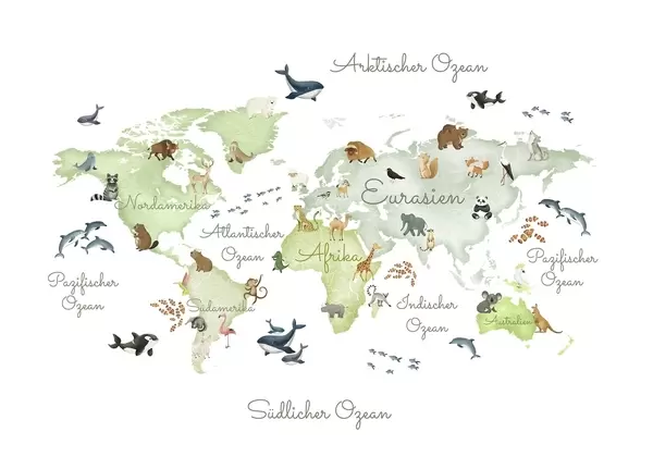 Fototapet O hartă verde în stil acuarelă, cu animale. Etichete în limba germană Nr. c00012dev2
