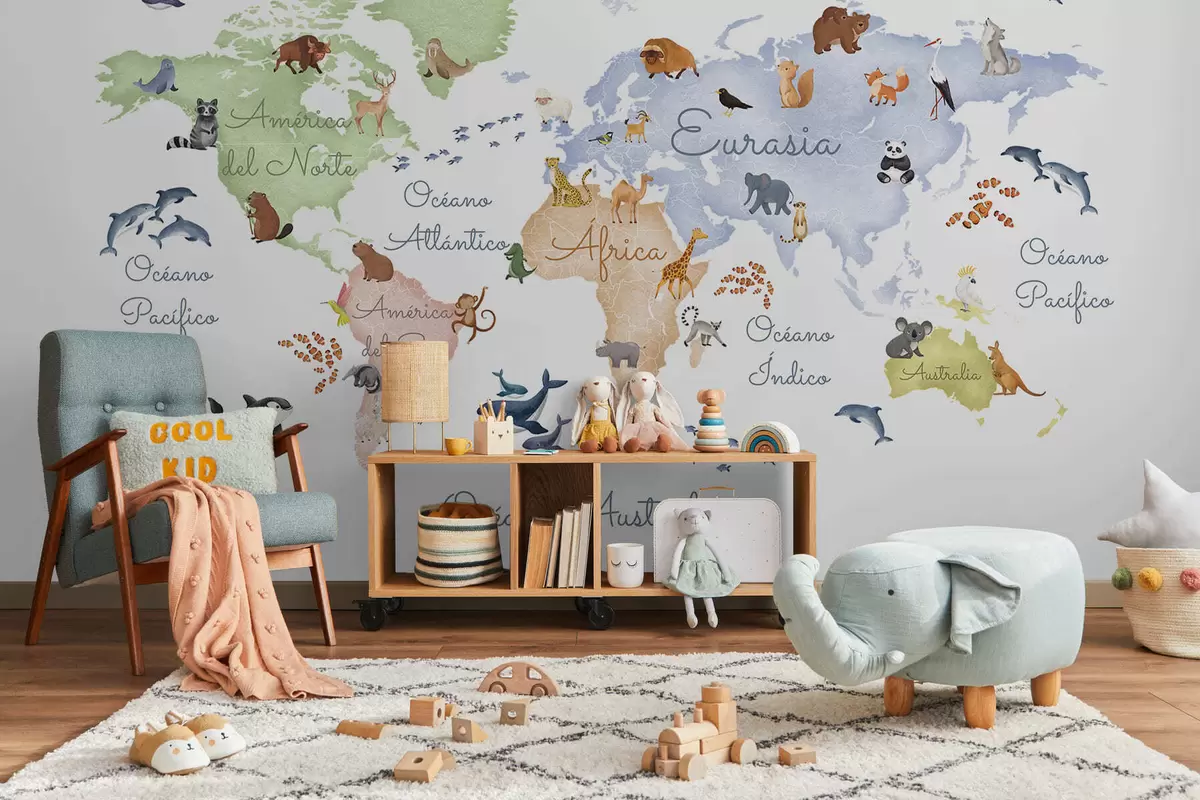 Fototapet O hartă colorată în stil acuarelă, cu animale. Denumiri în spaniolă Nr. c00012es