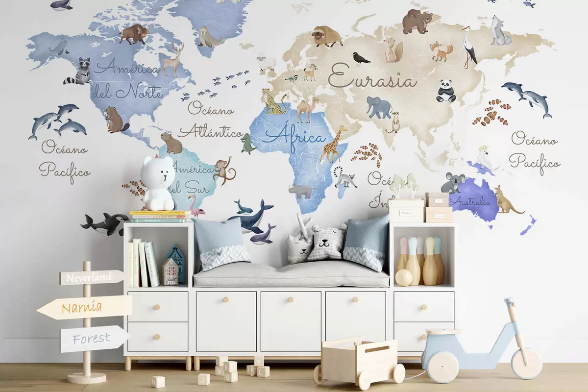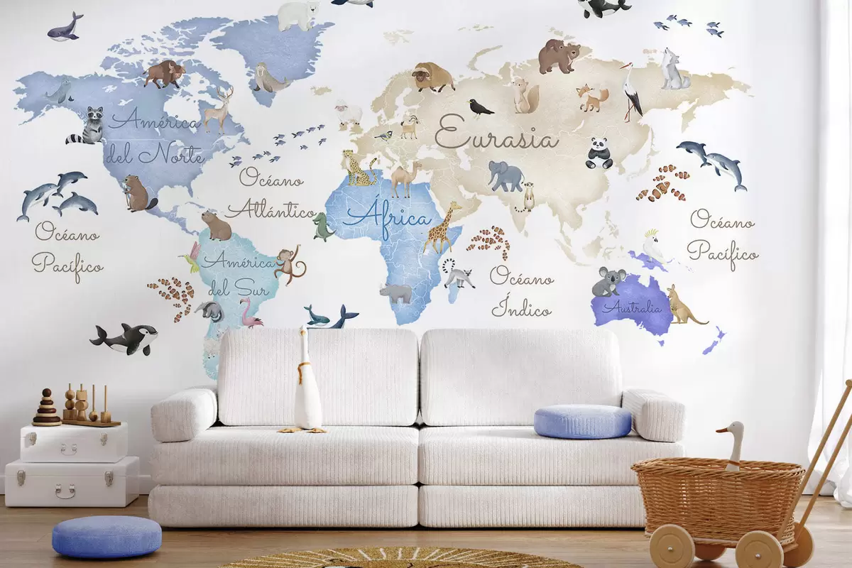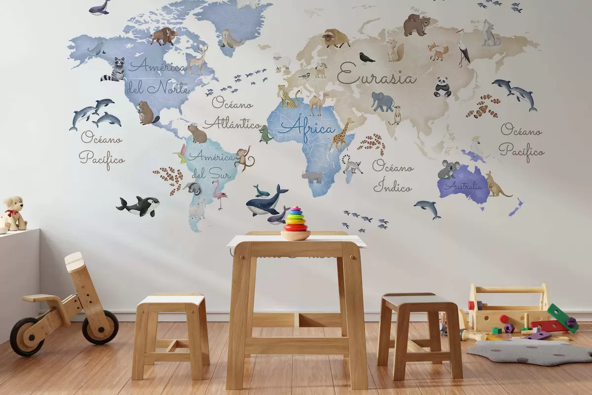 Fototapet O hartă albastră în stil acuarelă, cu animale. Etichete în spaniolă Nr. c00012esv1