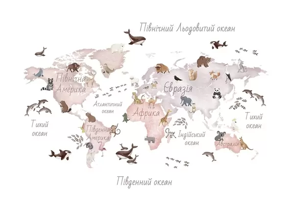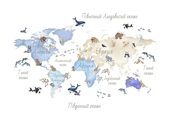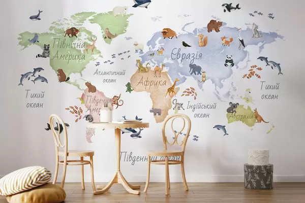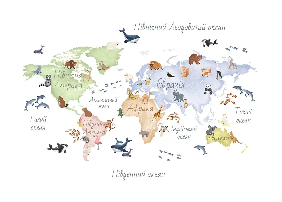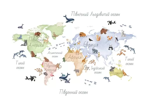 Fototapet O hartă colorată în stil acuarelă, cu animale. Etichete în limba ucraineană Nr. c00012uk