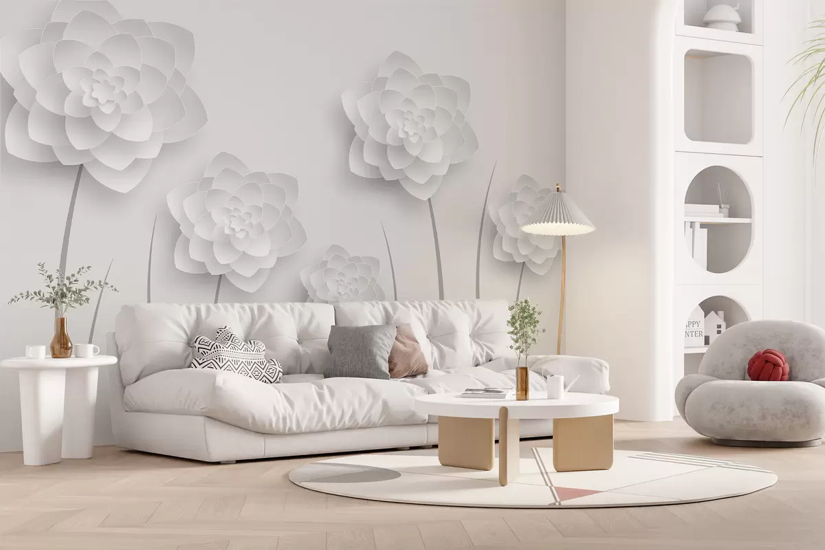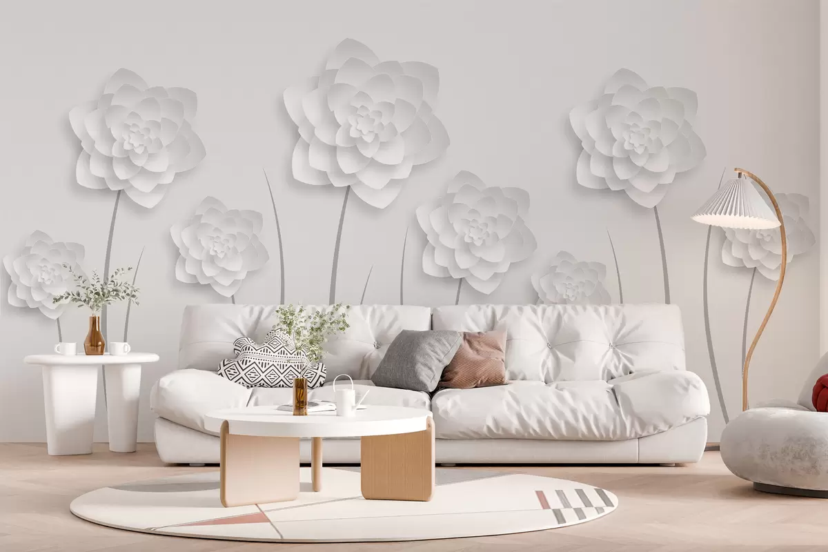 fototapet Flori mari cu imitație de volum în stil hârtie pe fond gri deschis cu tulpină gri w01021