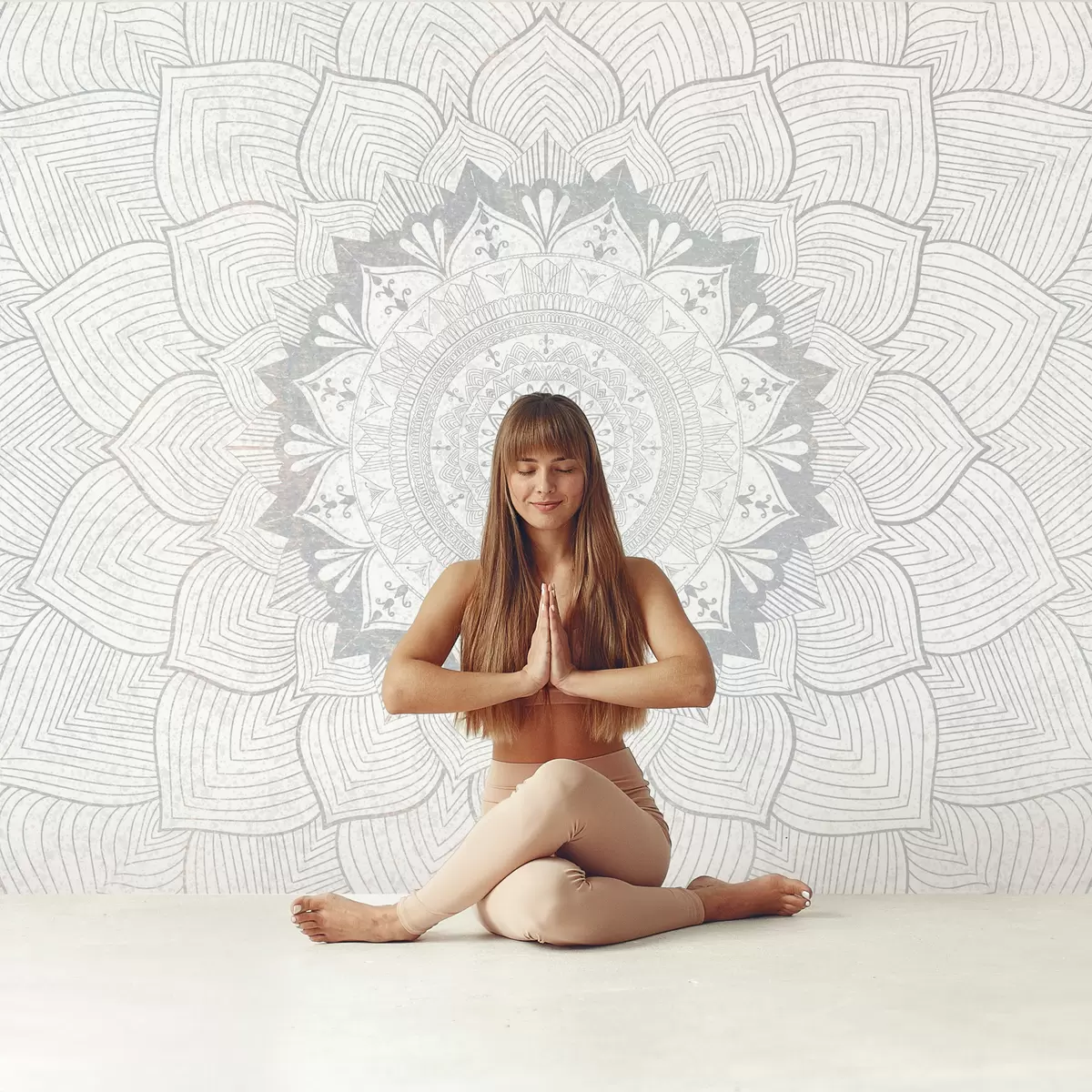 Fototapet Mandala rotundă, tapet pentru spațiul de yoga sau pentru a armoniza spațiul personal. Mandala de perete în nuanțe de gri pe un fundal eterogen texturat Nr. w01088v2