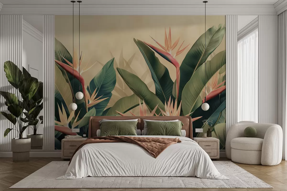 Fototapet Aranjament luxuriant de flori tropicale, înconjurat de frunze mari de culoare verde închis Nr. w01484v1