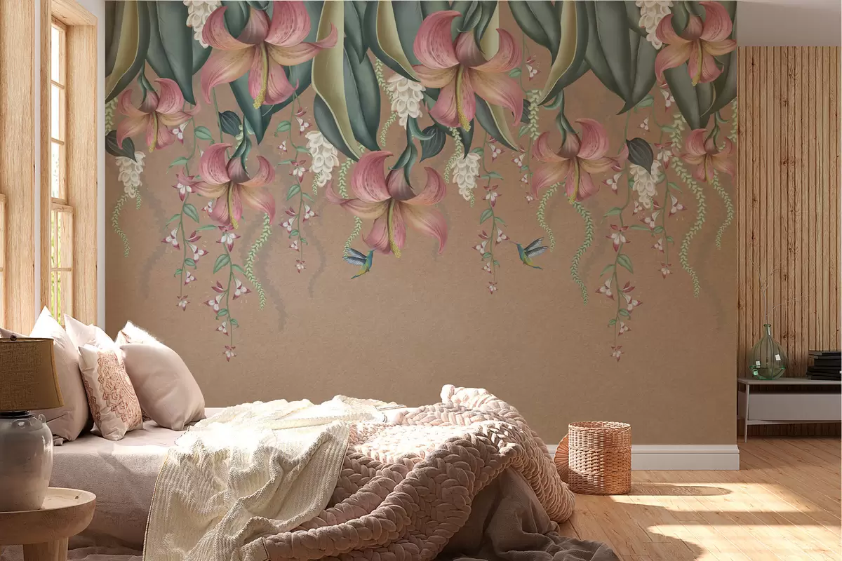 Fototapet Motiv botanic delicat cu crini agățați, flori și colibri pe un perete grunge Nr. w01523