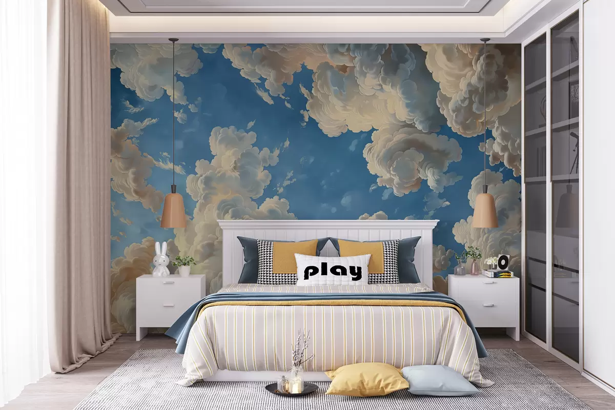 Fototapet Nori aerisiți în tonuri de crem, piersică moale și auriu pal, pe un cer albastru profund și vibrant Nr. w01583