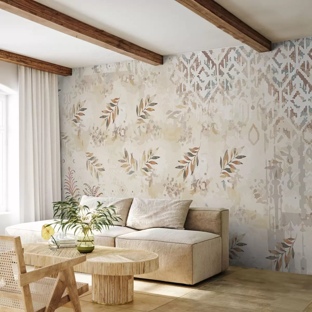 Fototapet tapet în stil retro cu modele, elemente de abraziune, pete și frunze, în culori bej Nr. w01955
