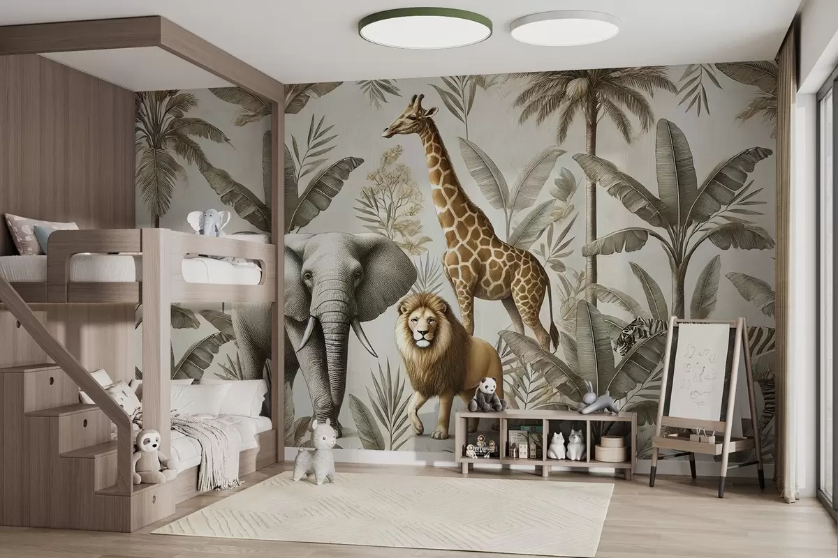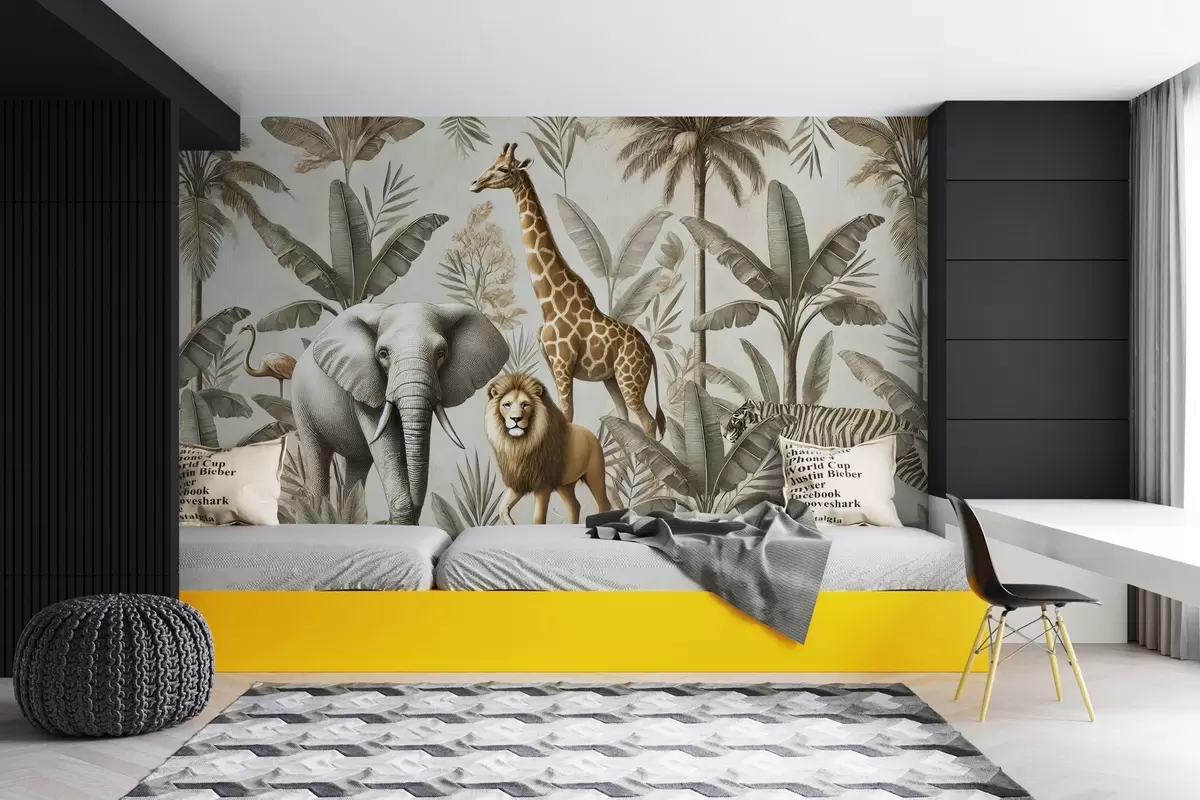 Fototapet Safari tapet pentru copii cu peisaj tropical și diverse animale în culori elegante Nr. w01956
