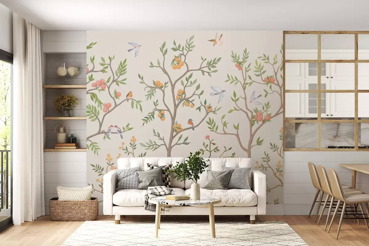 Fototapet Design Chinoiserie cu păsări, copaci sinuoși, fructe și flori Nr. w02128