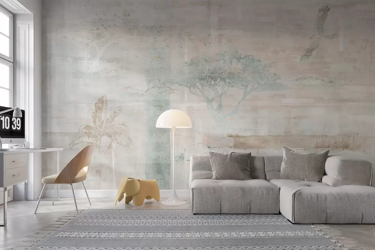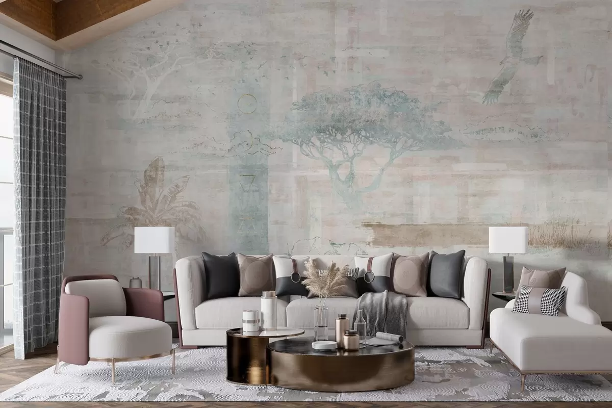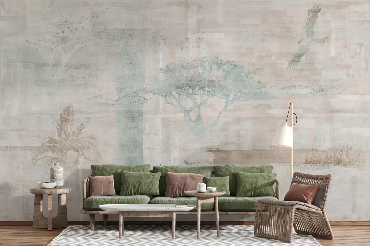 Fototapet Vintage grunge efect de design cu copaci, vultur și elemente geometrice Nr. w02130