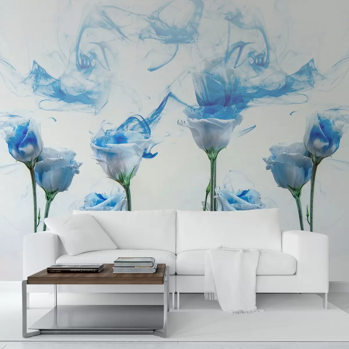 Fototapet Trandafiri albi sub apă pe un fundal alb cu dungi de vopsea acrilică albastră. Nr. w02139