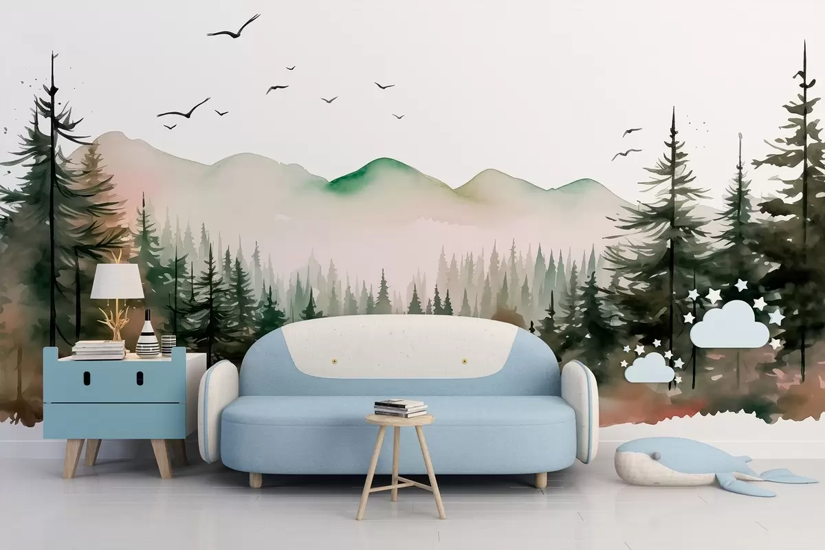 Fototapet Pădure acuarelă și peisaje montane, culori verzi și roz Nr. w02150v1