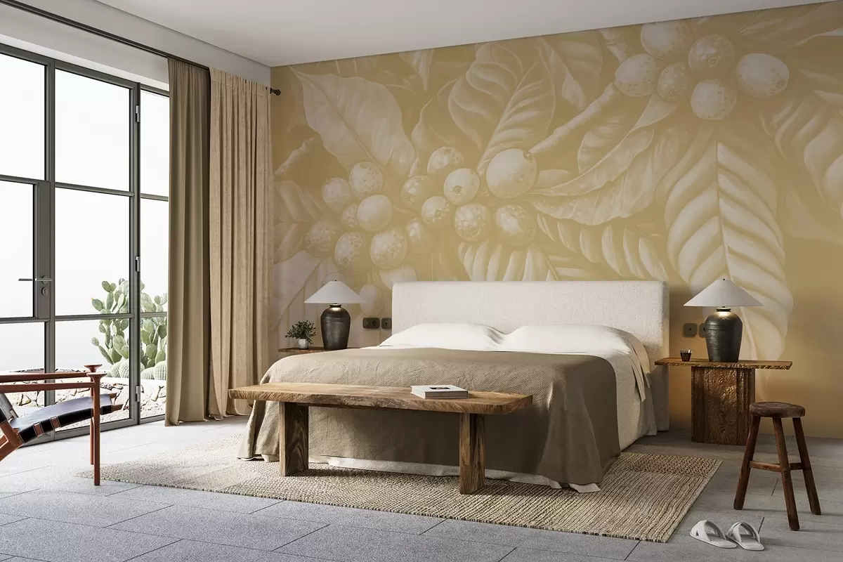 Fototapet Ramuri de plante de cafea cu fructe și elemente tropicale în nuanțe de bej Nr. w02209v1