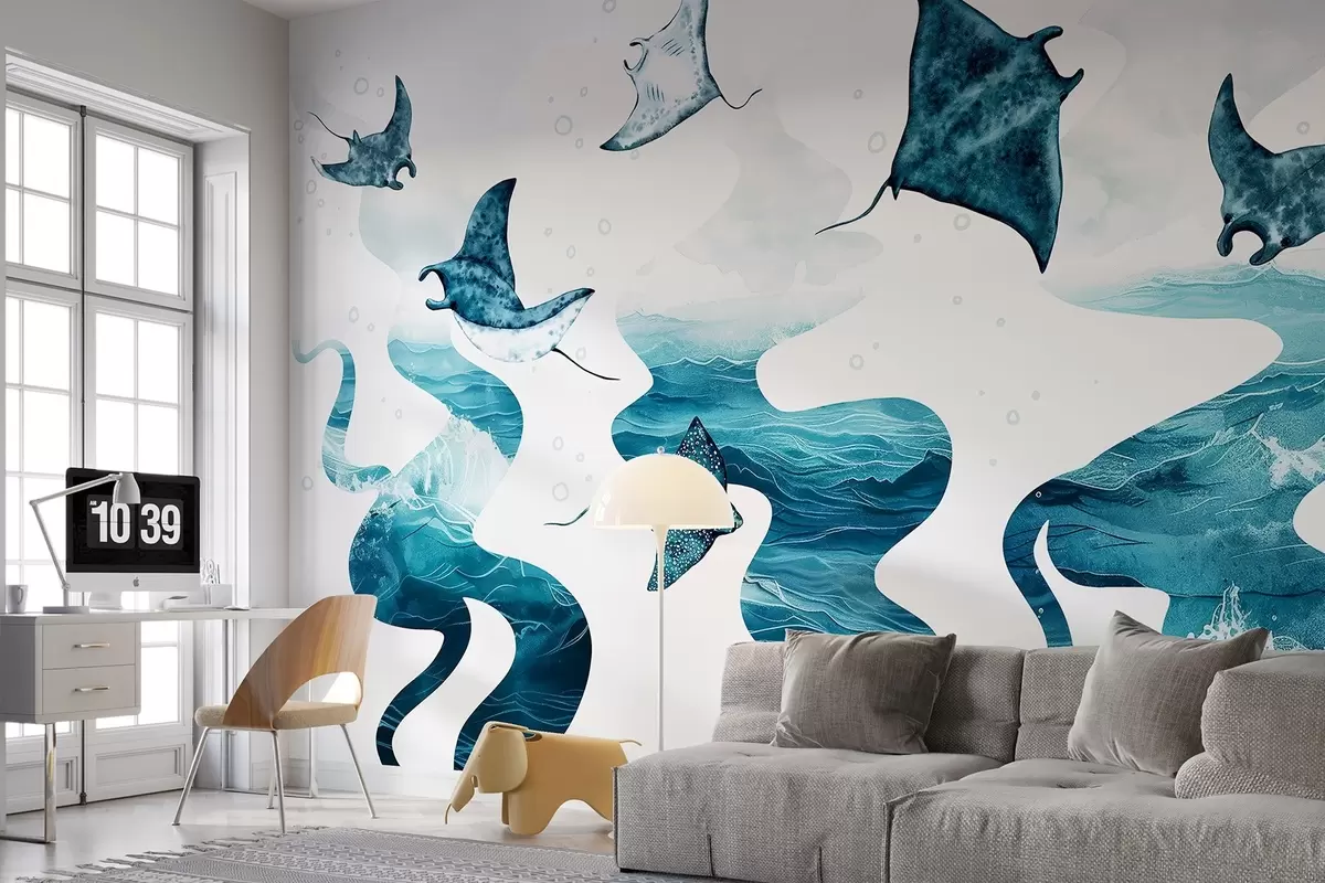 Fototapet Manta ray pește, stil acuarelă, mare, ocean, culori albastre Nr. w02266