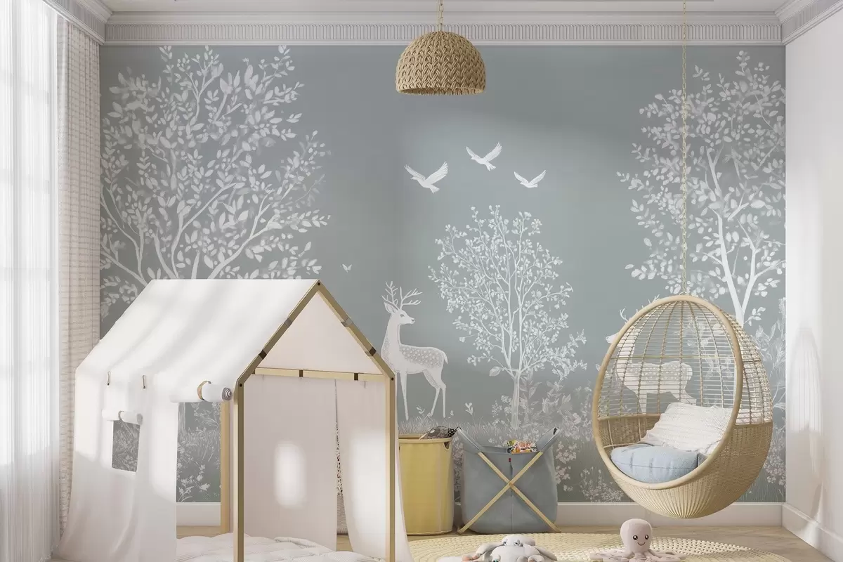 Fototapet pădure cu căprioare în stilul unui desen cu cretă pe un fundal gri Nr. w02444v2