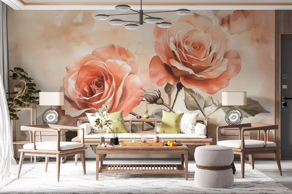 Fototapet Frumoși trandafiri roșii în stil acuarelă, florale, culori bej Nr. w02486