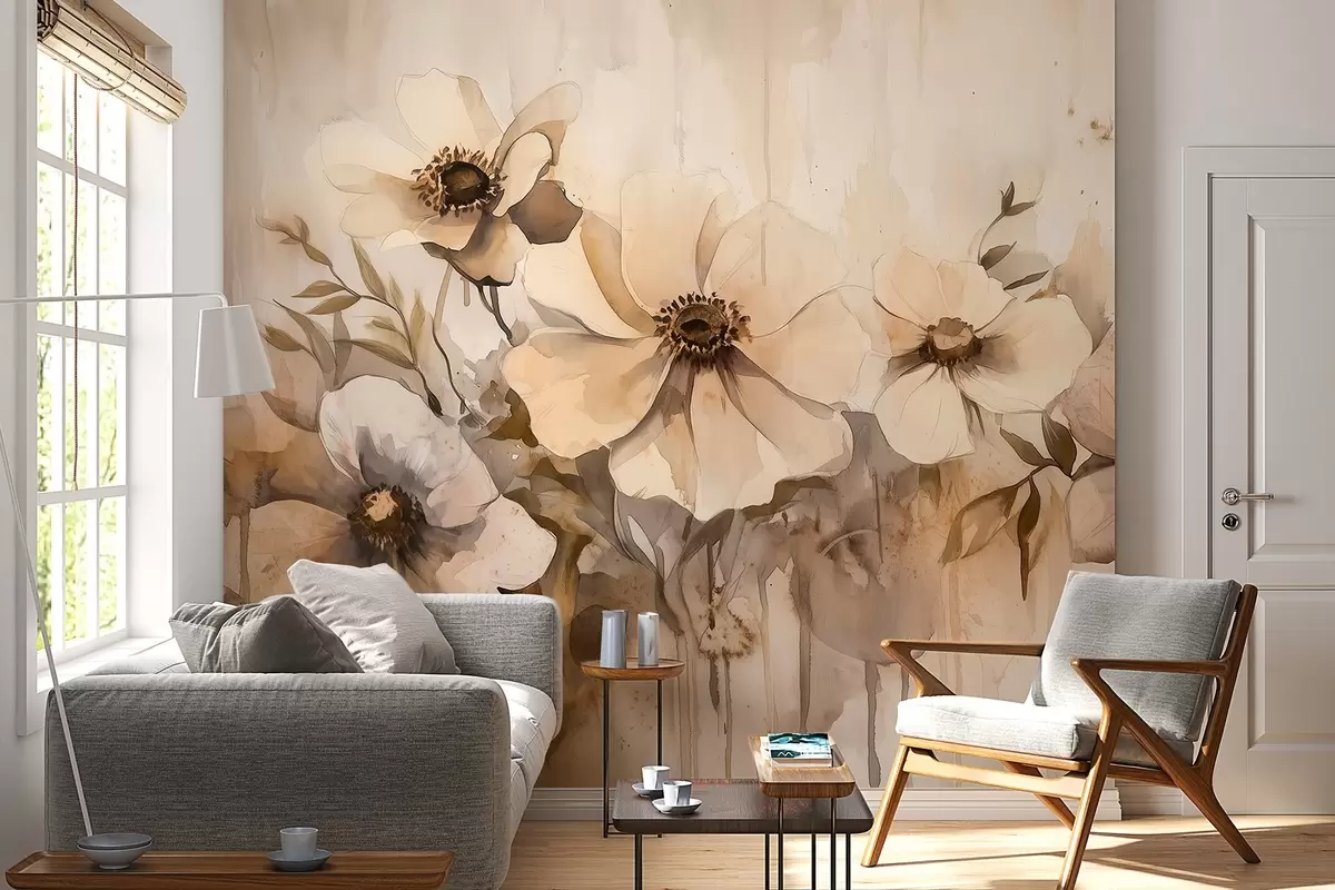fototapet Flori rustice, desen în stil acuarelă, culori bej w02487