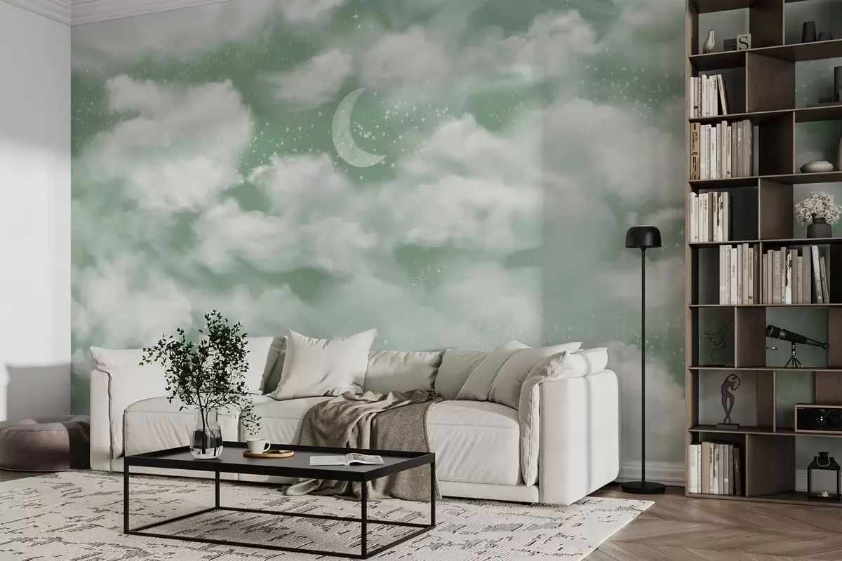 Fototapet Cer înstelat cu lună și nori, visător, eteric, culori verzi moi Nr. w02515v2