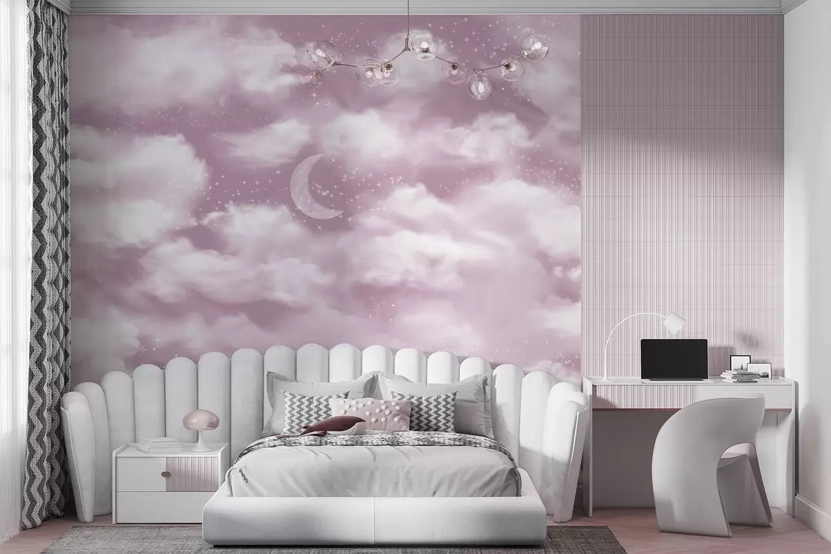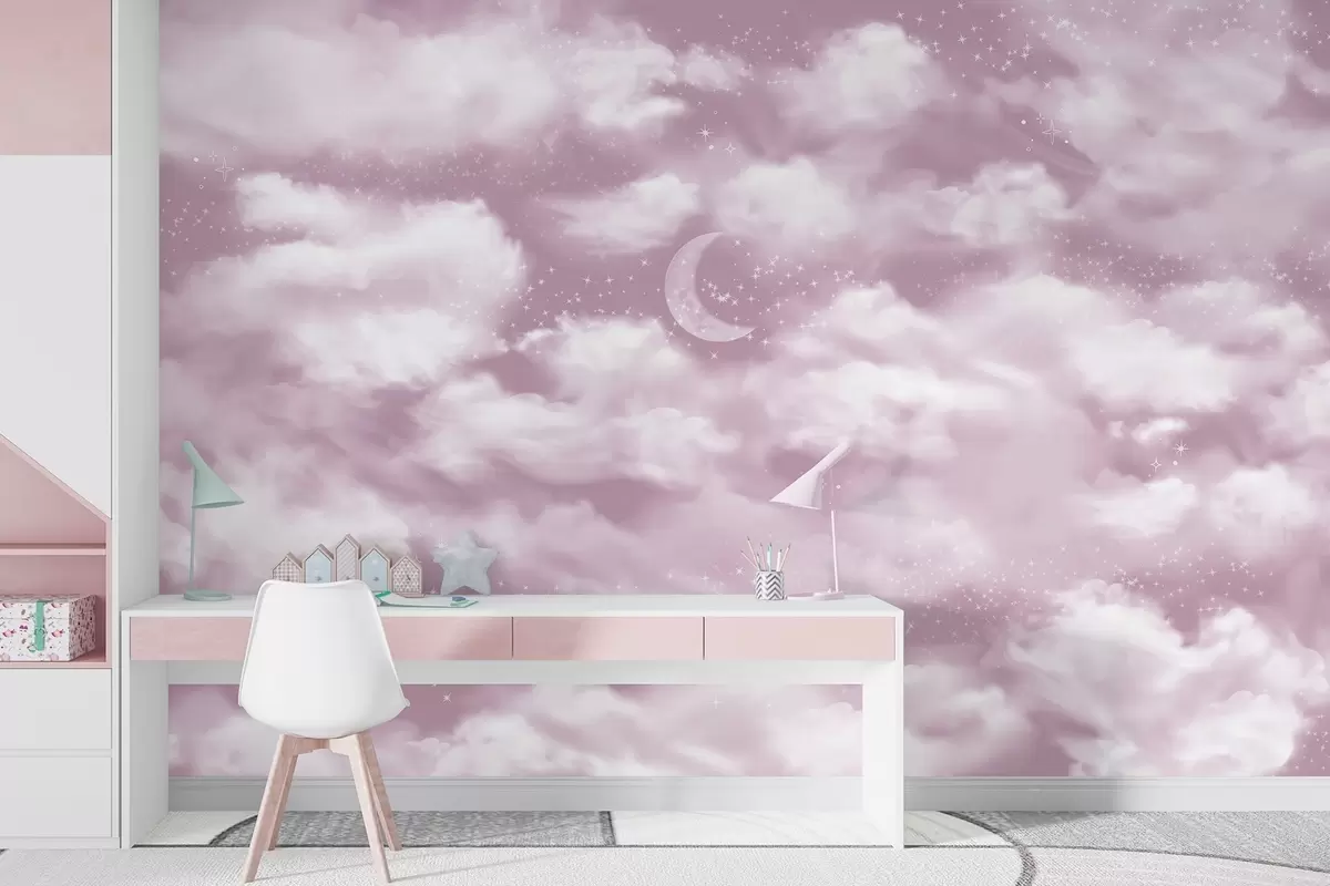 Fototapet Cer înstelat cu lună și nori, visător, eteric, culori roz moi Nr. w02515v3
