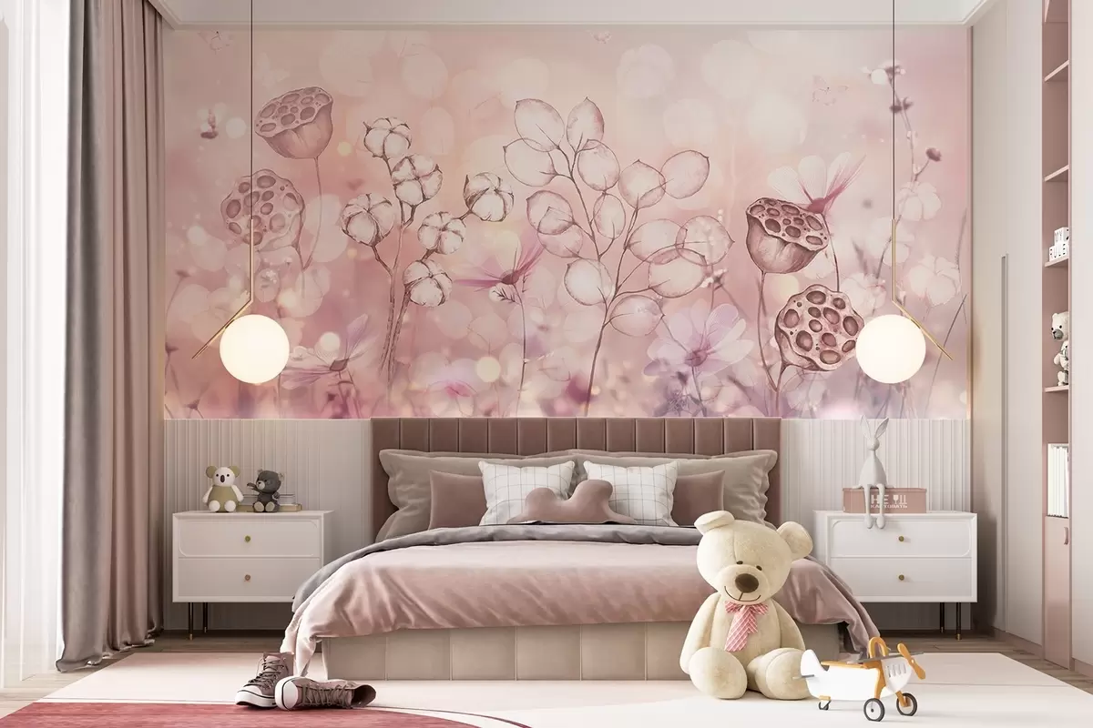 Fototapet Grădină de flori visătoare, fluture, flori de bumbac, lotus, culori roz Nr. w02516