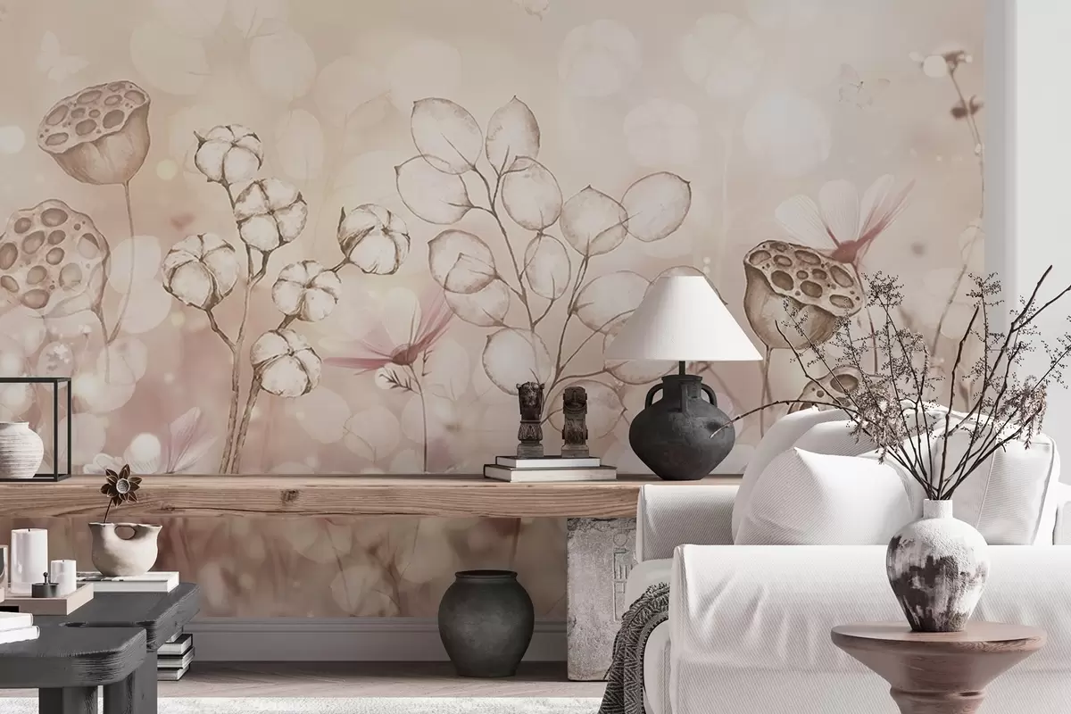 Fototapet Grădină de flori visătoare, fluture, flori de bumbac, lotus, culori bej Nr. w02516v3