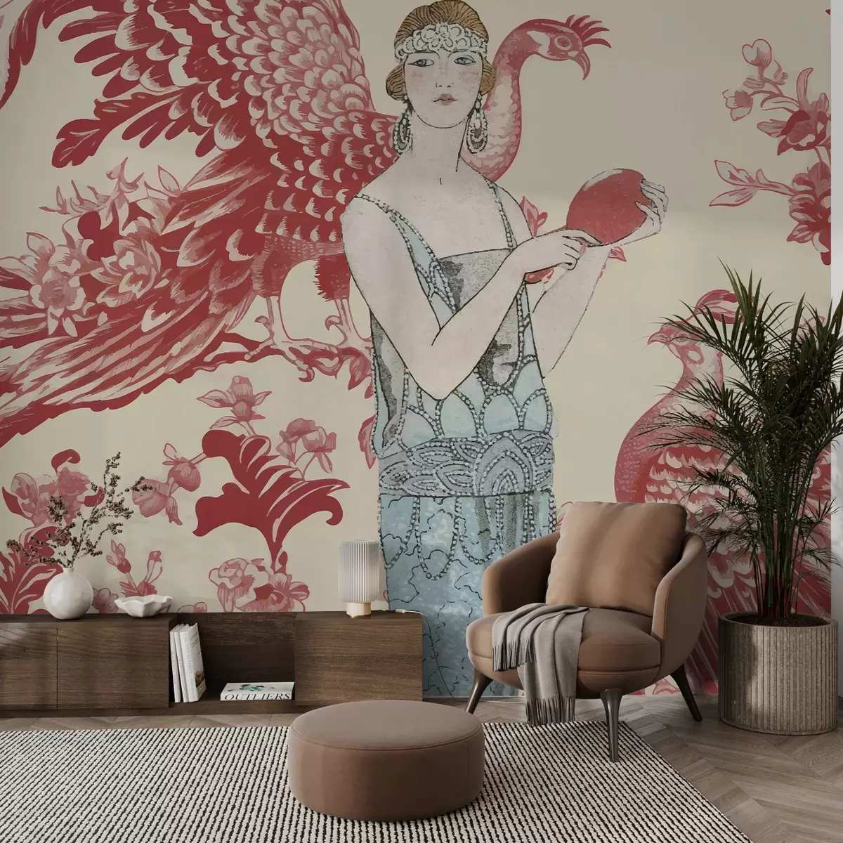 Fototapet Model floral vintage elegant cu o femeie în culori roșii Nr. w02532v1
