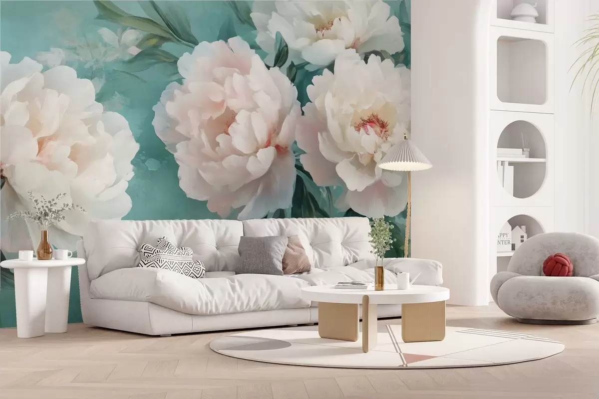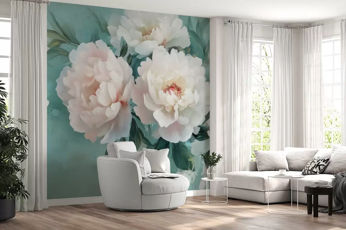Fototapet flori mari de bujori luxuriante pe un fundal turcoaz Nr. w02763