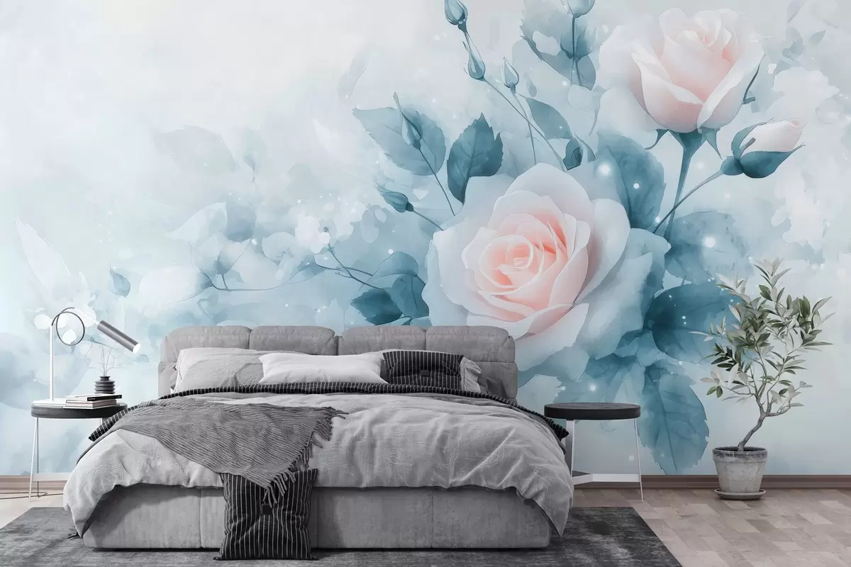 Fototapet Trandafiri piersici delicați în nuanțe de turcoaz în stil acuarelă Nr. w02871