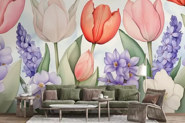 Fototapet Flori de primăvară, lalele, hiacint, desen în stil acuarelă, floral Nr. w02940