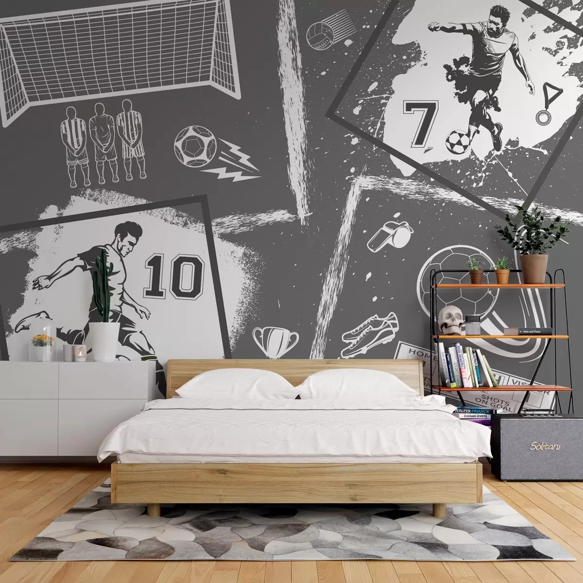 Fototapet Jucători de fotbal, minge și alte atribute de fotbal în tonuri de gri Nr. w03122v1