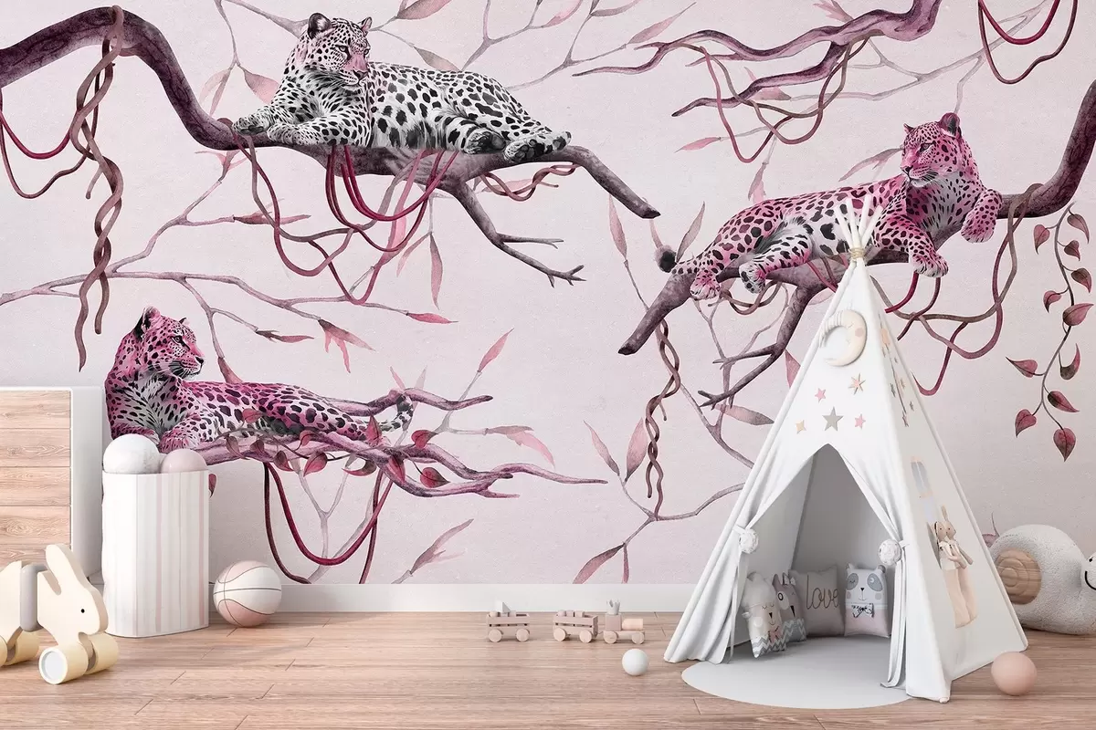 Fototapet Leoparzi pe copacii junglei, liane, tropicale, animale sălbatice, paletă de culori roz Nr. w03146v2